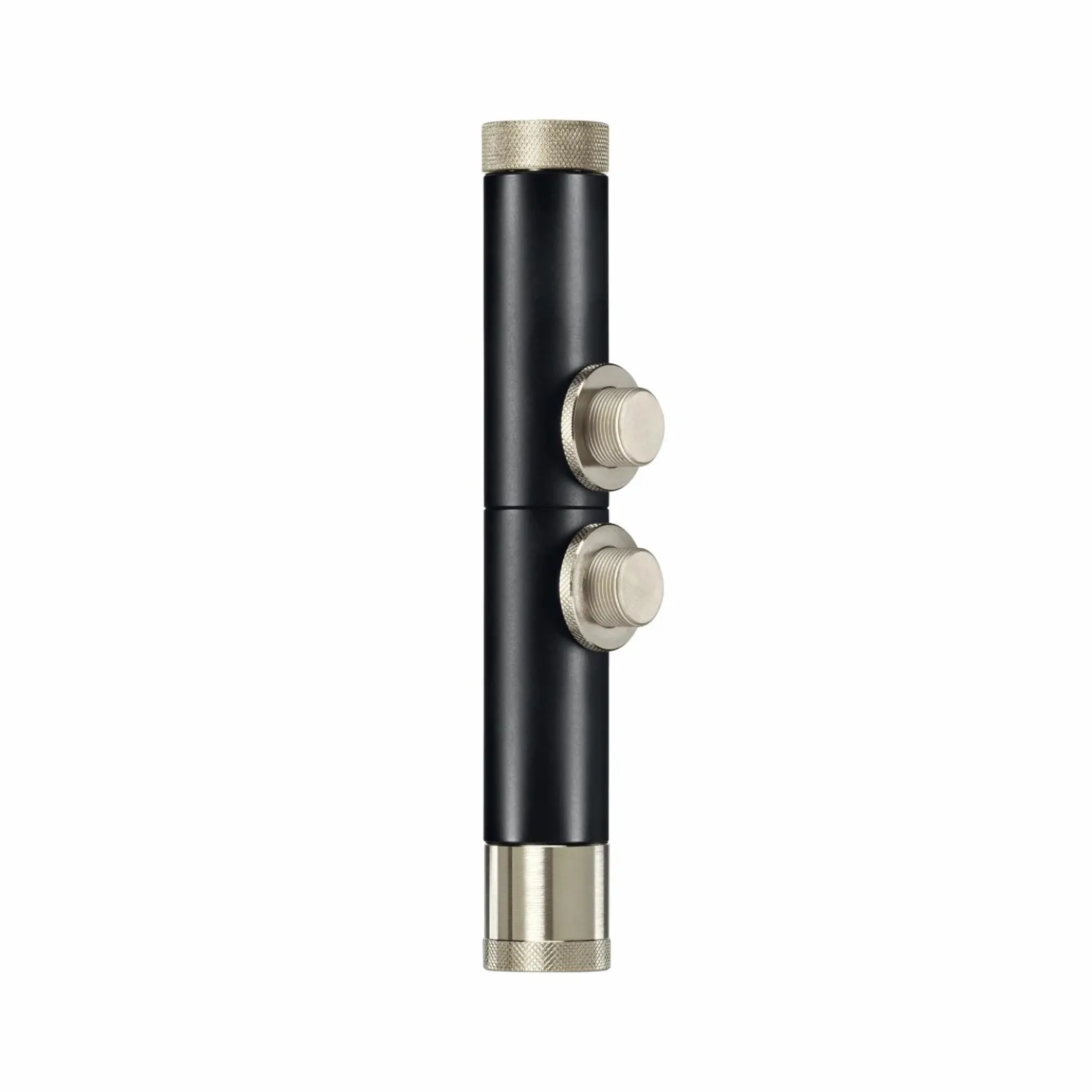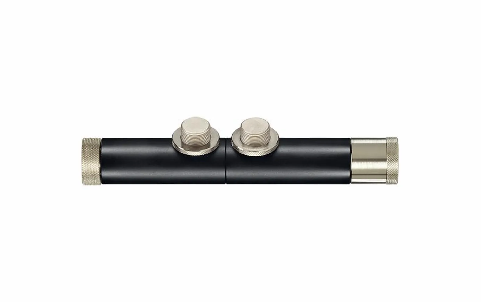 Stereo microphone adapter holds two microphones in selectable positions for stereo broadcasting, recording, or sound reinforcement.