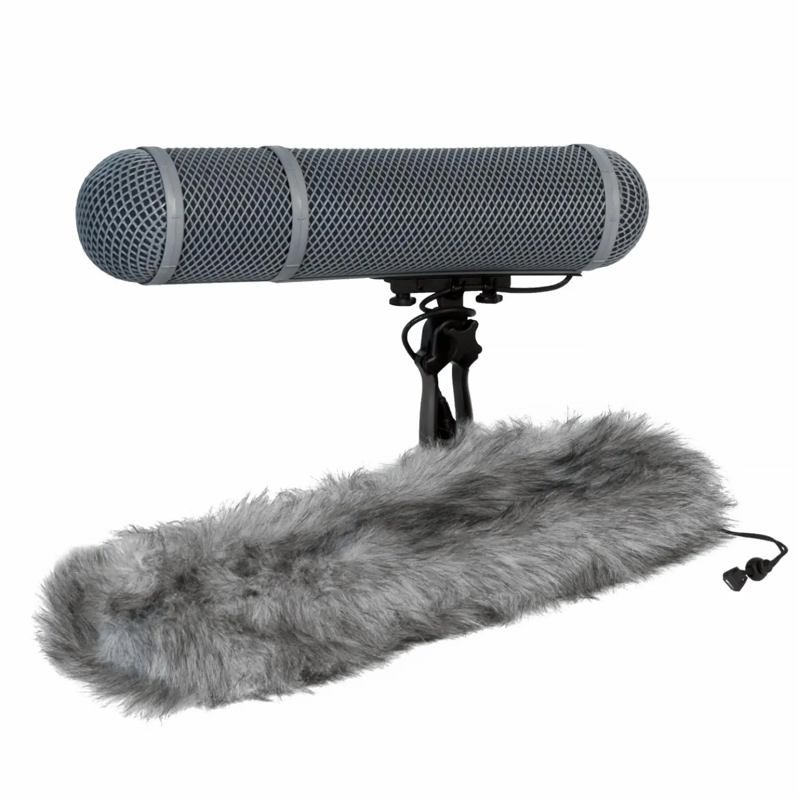 Windshield basket completely surrounds the microphone and its connector, sliding onto the suspension. High-quality synthetic fur windjammer is designed to fit perfectly over the windshield and features a drawstring and toggle for a snug fit. Windshield and windjammer attenuate up to 38 dB of wind noise.