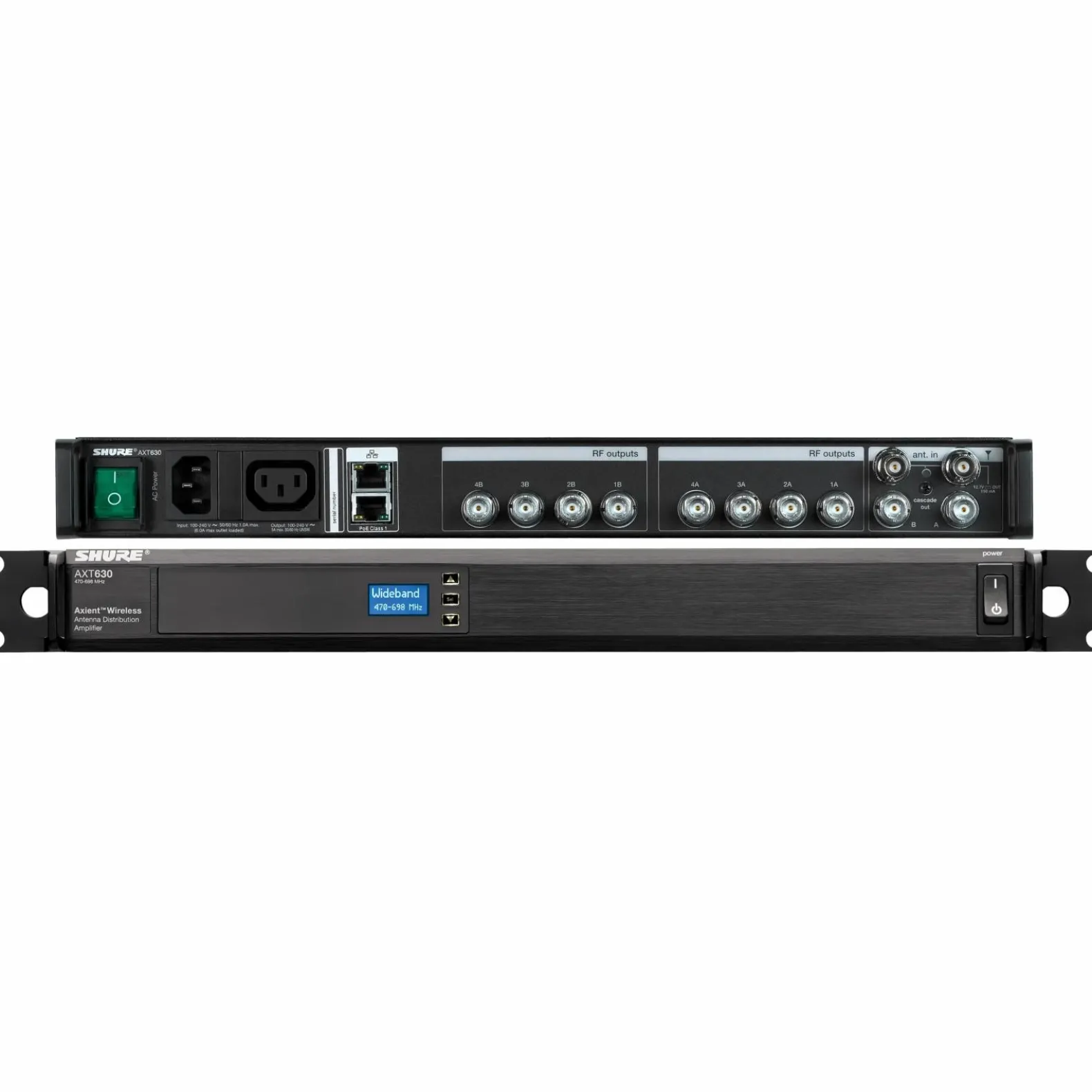 The AXT630 features selectable 60 MHz input filters that match the available frequency bands of Axient transmitters, providing extra protection from strong out-of-band signals and a lower overall RF noise floor. Four BNC antenna output pairs distribute filtered signal to receivers, and an unfiltered RF cascade port is included to connect wideband devices like the Axient Spectrum Manager. Networkable via Ethernet connection, the AXT630 enables WWB6 control of filtering ranges, antenna power and attenuation.