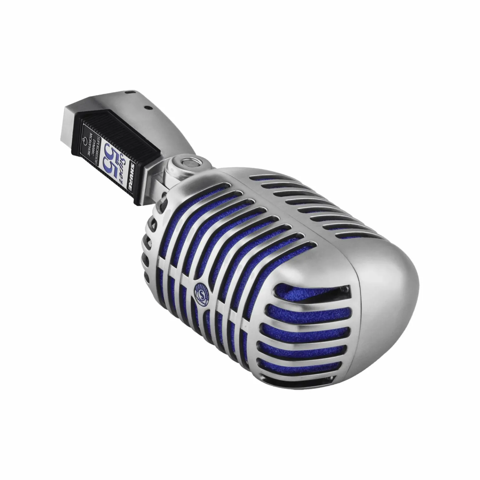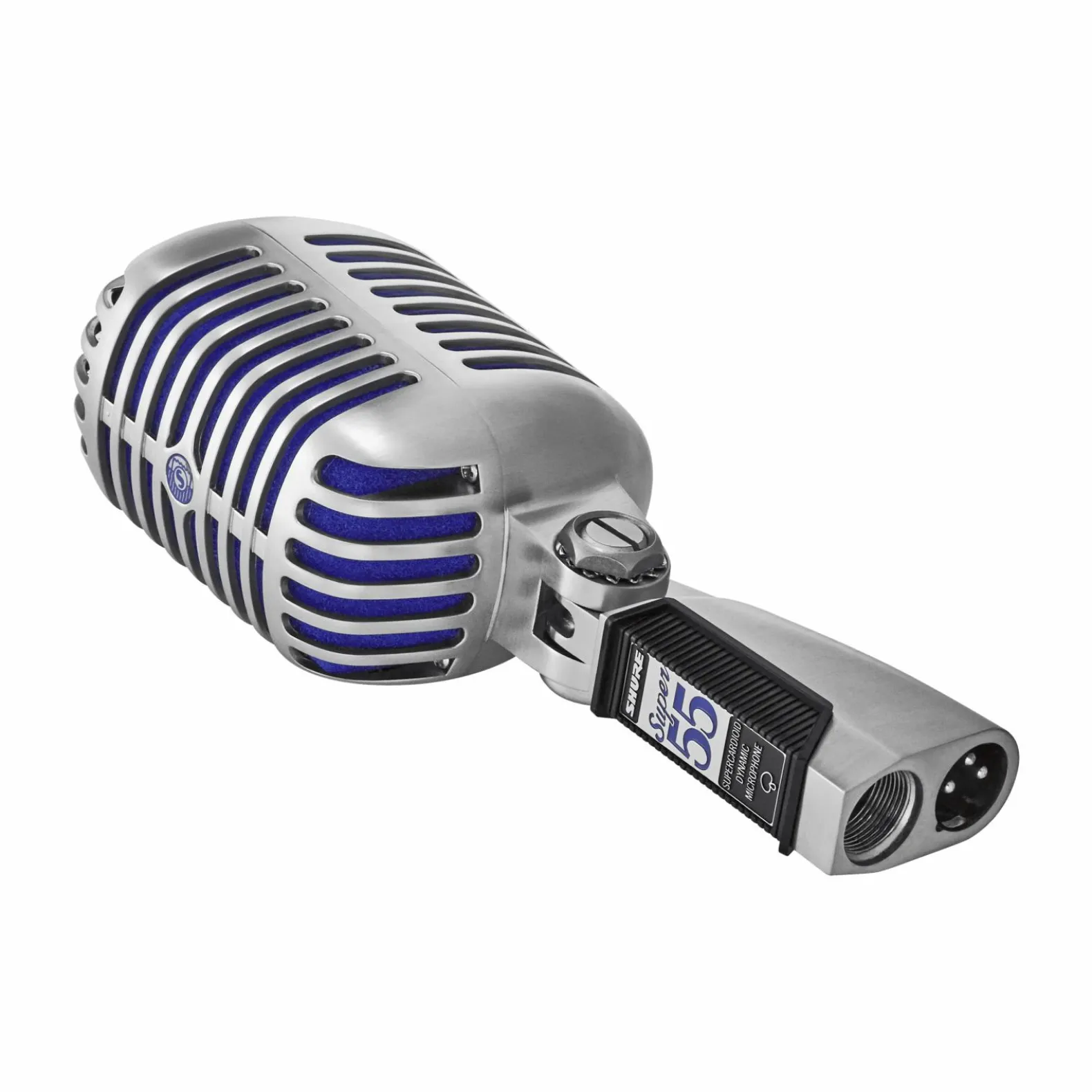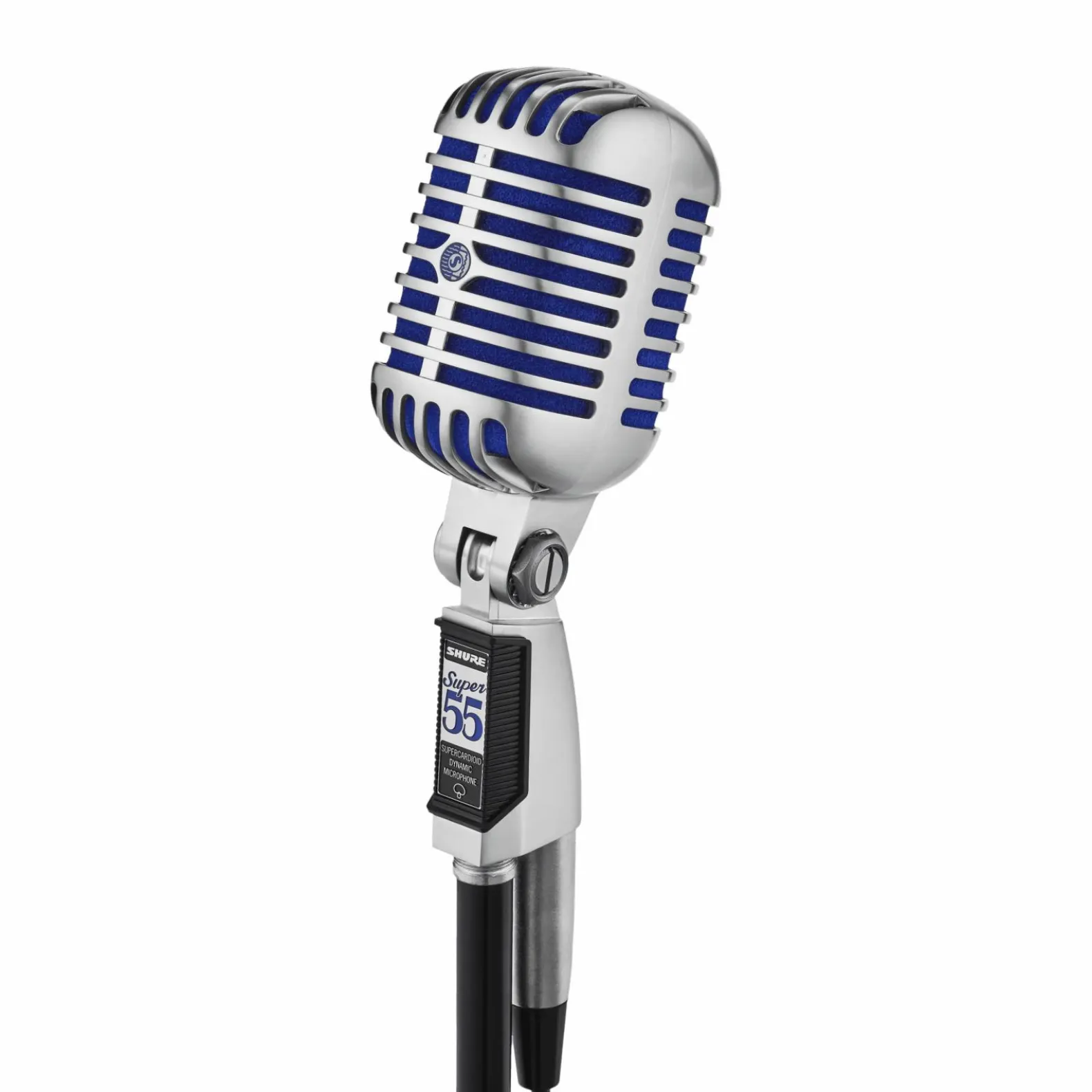 The Super 55 Deluxe Vocal Microphone features a signature satin chrome-plated die-cast casing, Supercardioid polar pattern, vibrant blue foam, and tailored frequency response for natural vocals and speech. Integrated, swivel stand mount is included.