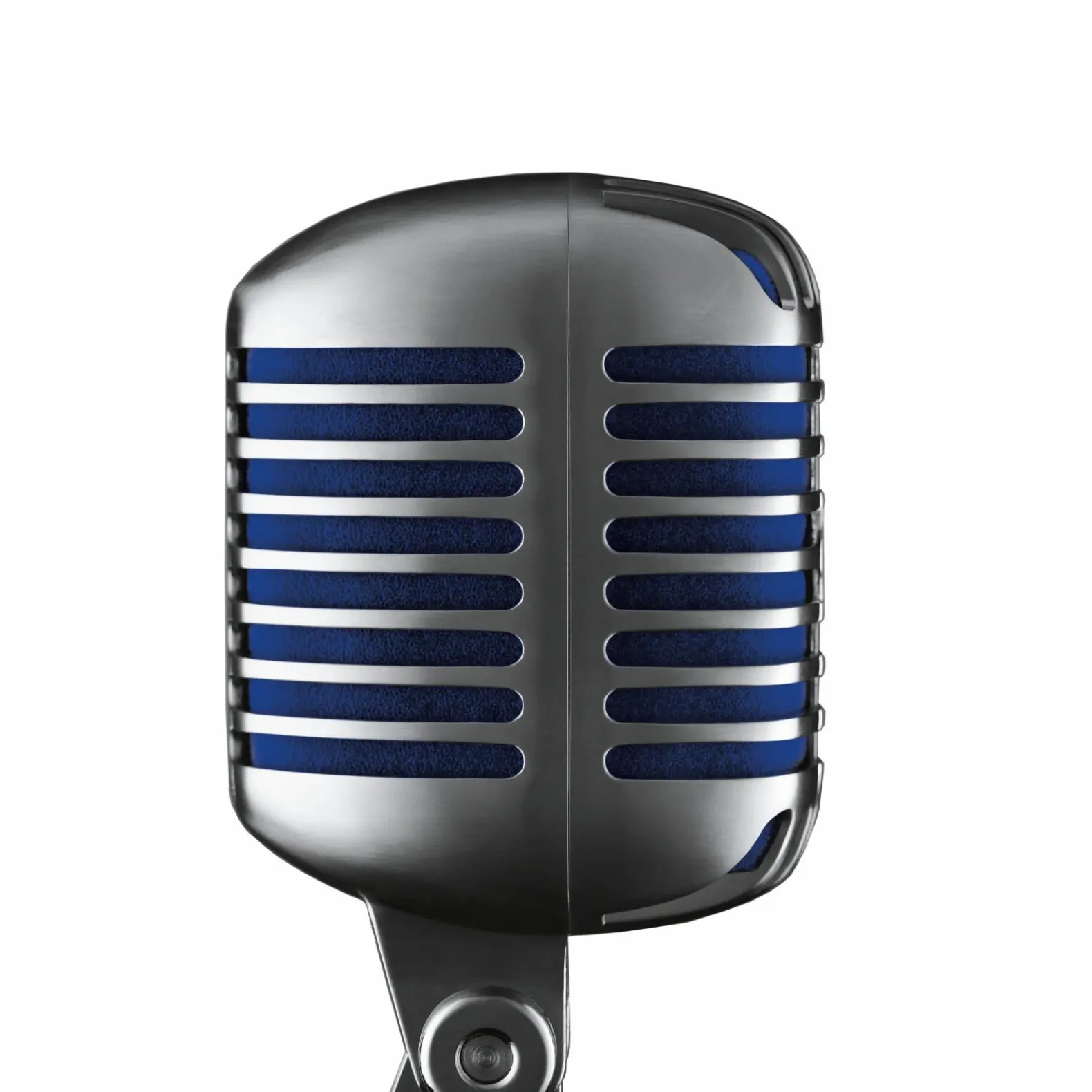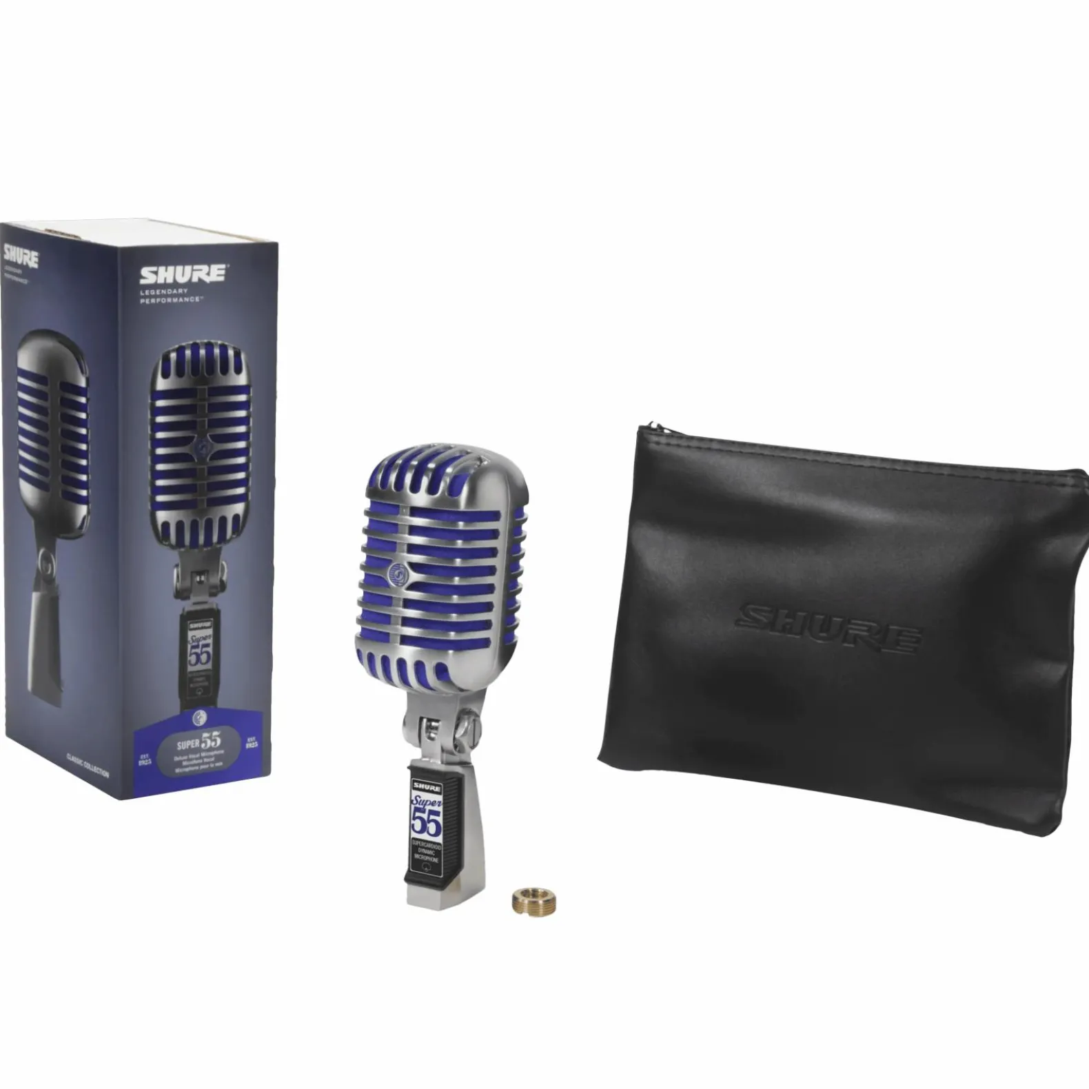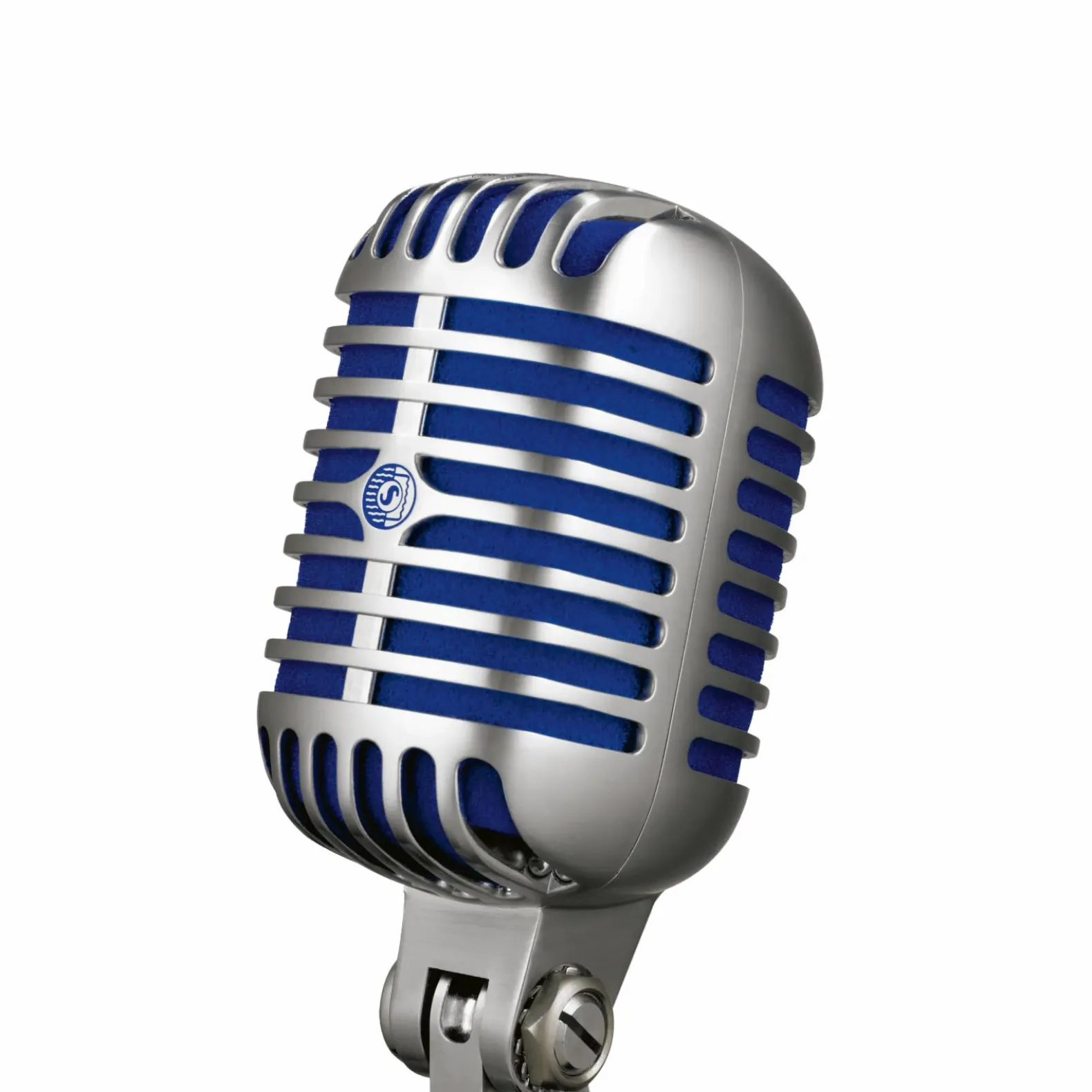 The Super 55 Deluxe Vocal Microphone features a signature satin chrome-plated die-cast casing, Supercardioid polar pattern, vibrant blue foam, and tailored frequency response for natural vocals and speech. Integrated, swivel stand mount is included.