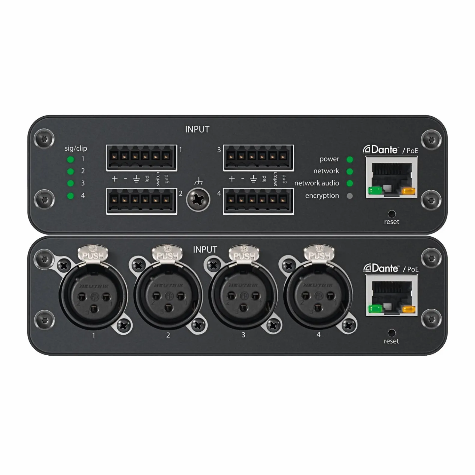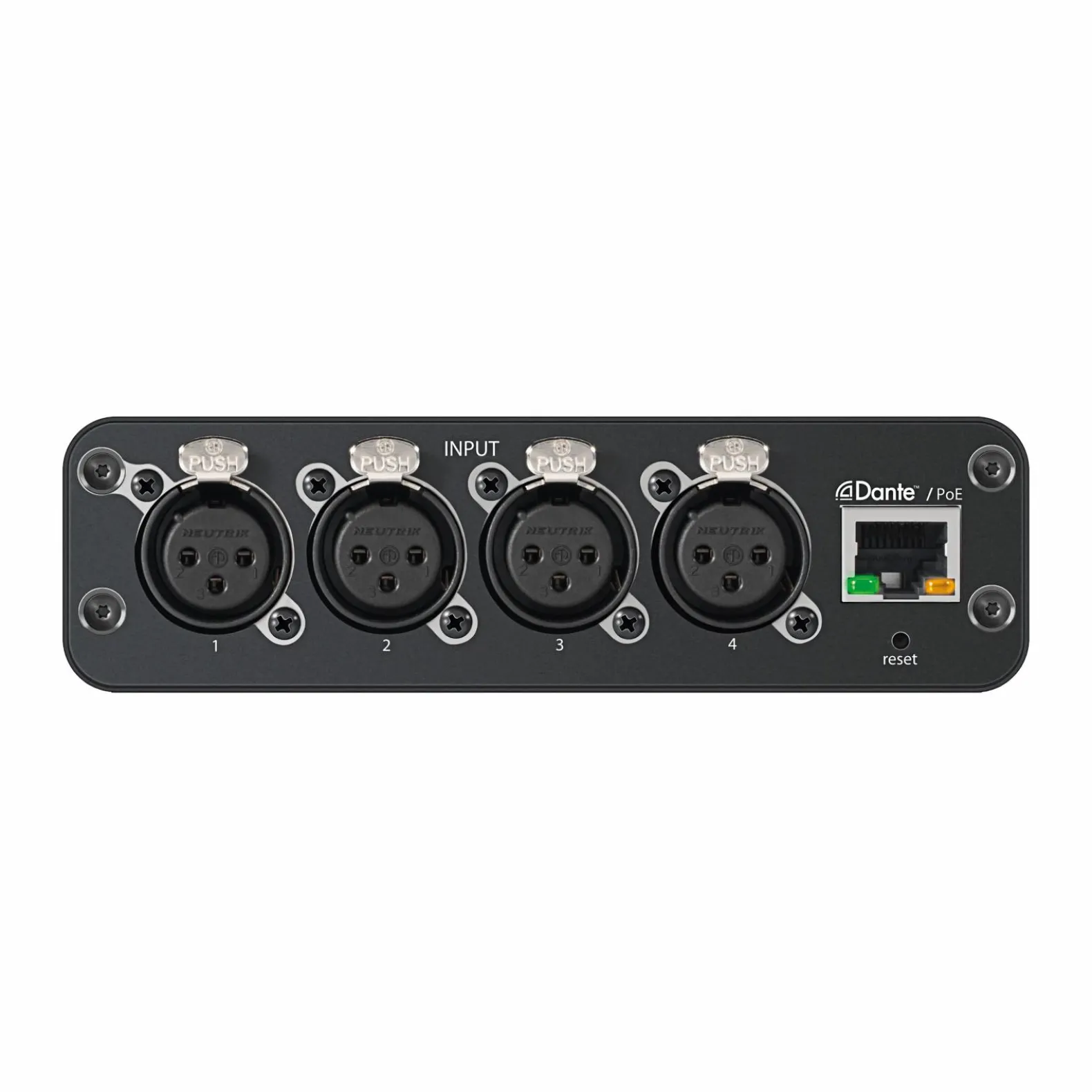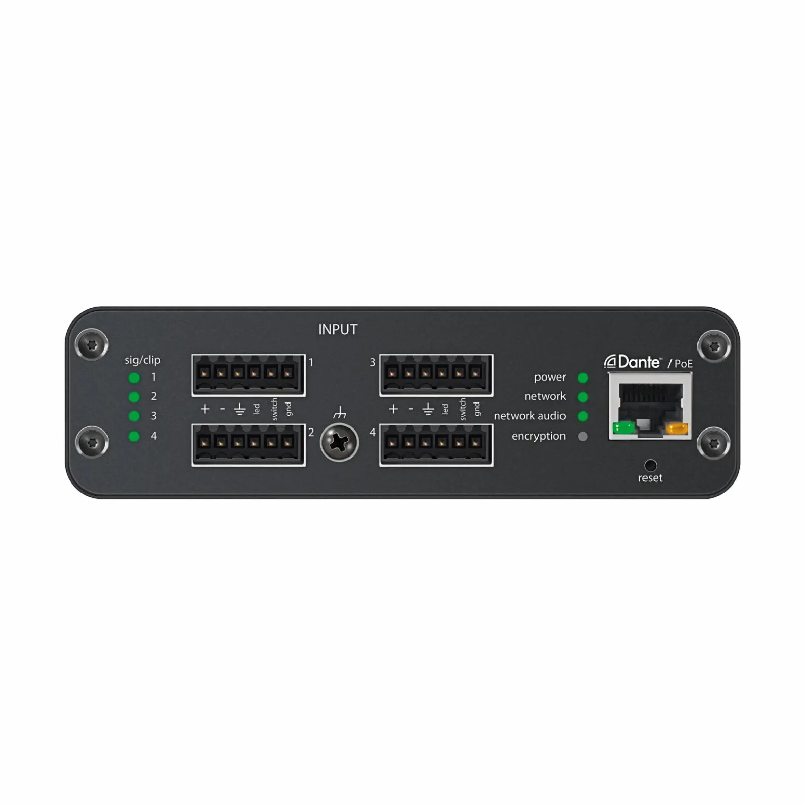 Converts up to four line / mic analog signals onto a Dante network for easy audio routing and browser-based control.