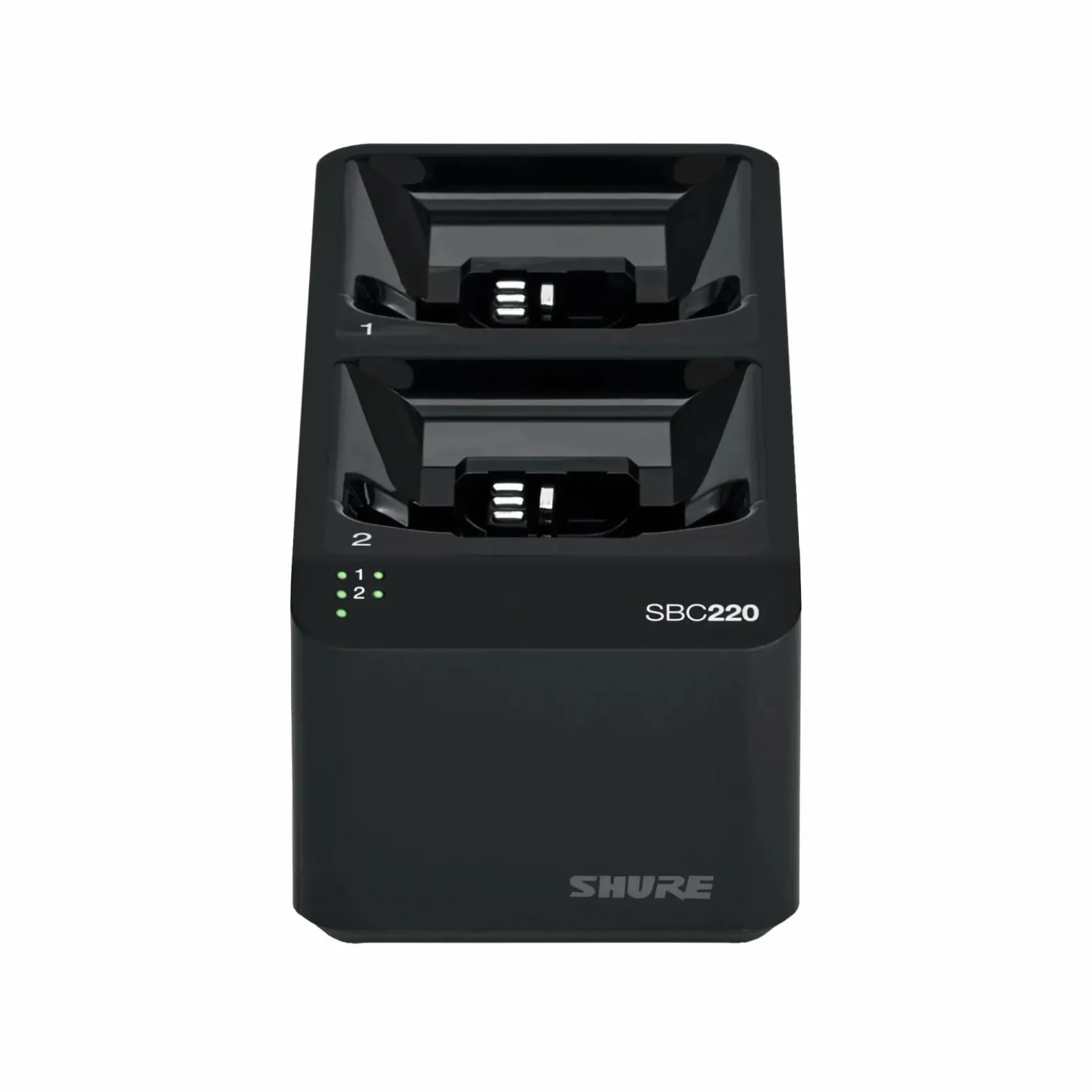 The SBC220 2-Bay Networked Charging Station enables docked charging and storage for any combination of twosb900b batteries or ULXD1, QLXD1, AD1 (bodypack) or ULXD2, QLXD2 or AD2 (handheld) wireless transmitters. When the connected to a network, the charging status of each transmitter can be viewed remotely while the transmitters are in the charger, using Shure Wireless Workbench® Management software. Up to four SBC220 units can be linked together to share power and network connectivity.