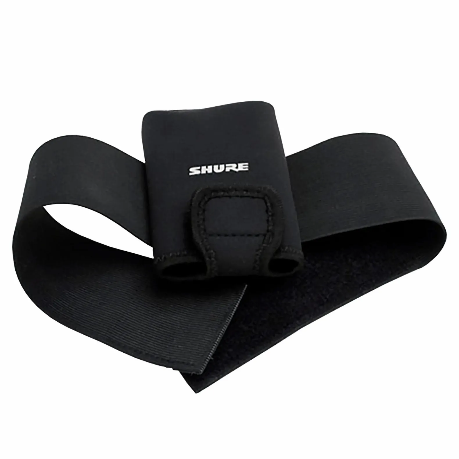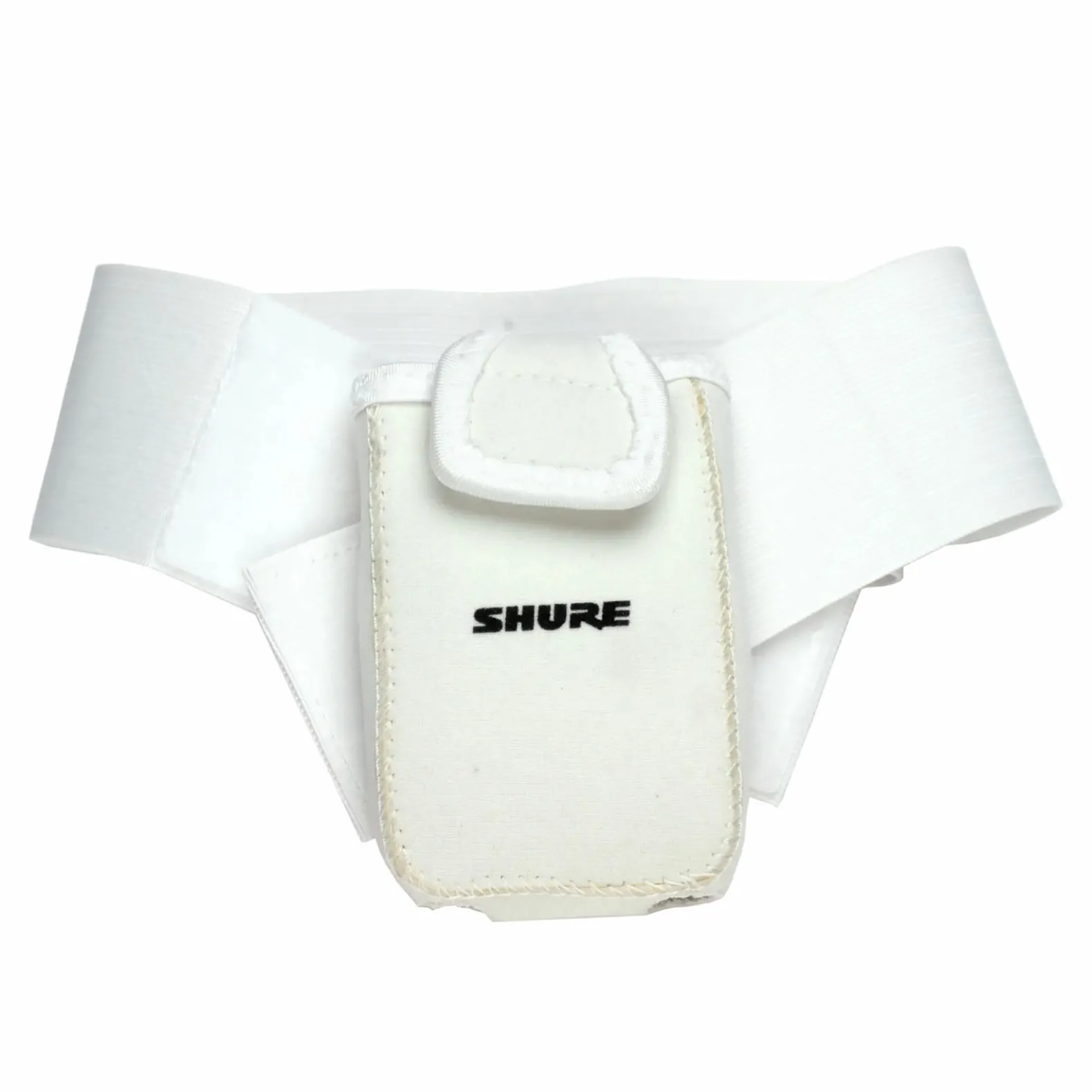 Cloth pouch holds and protects the UR1 Bodypack Transmitter. Features include an elastic belt with hook-and-loop closure to attach the transmitter to the performer’s waist.